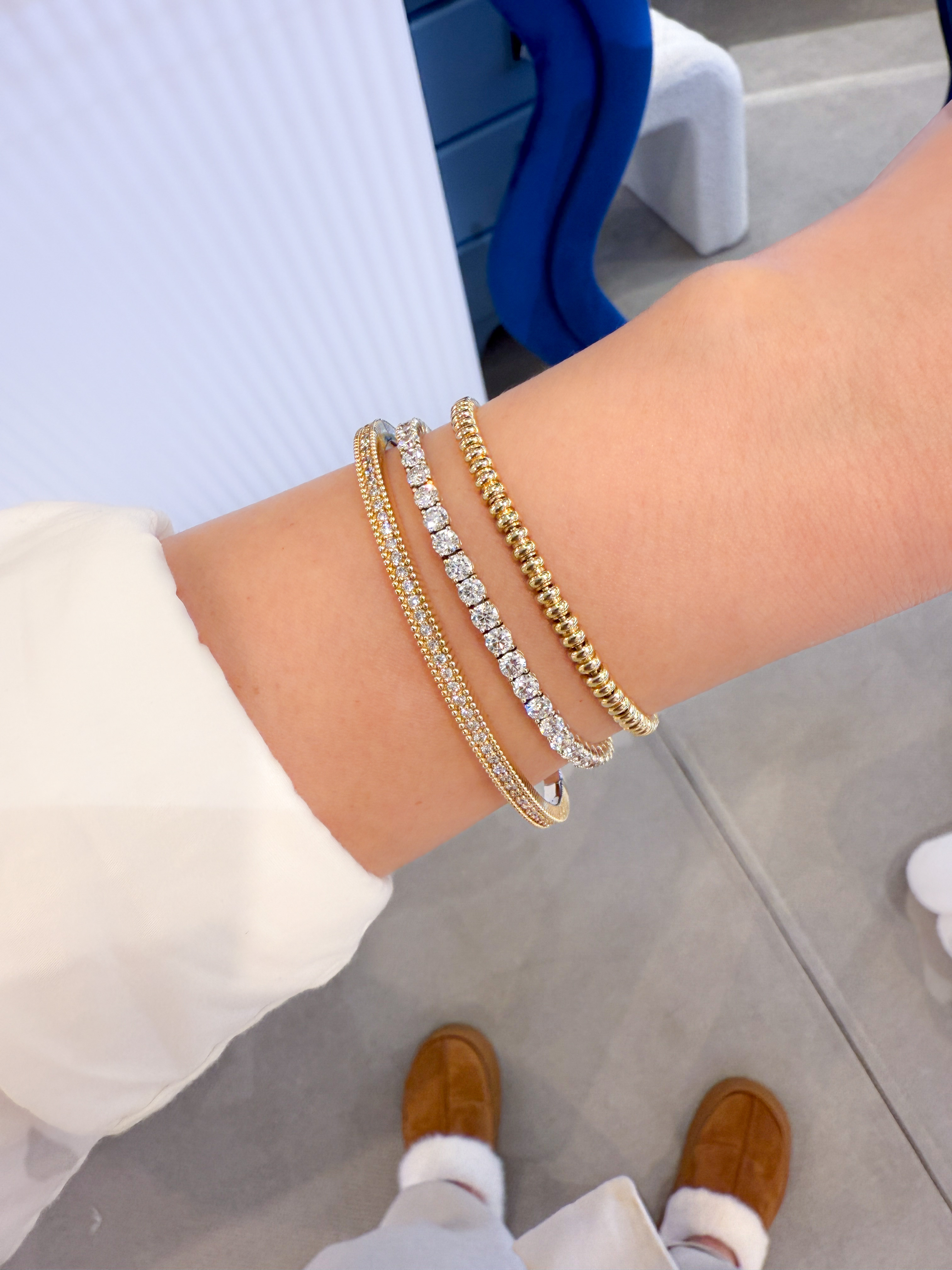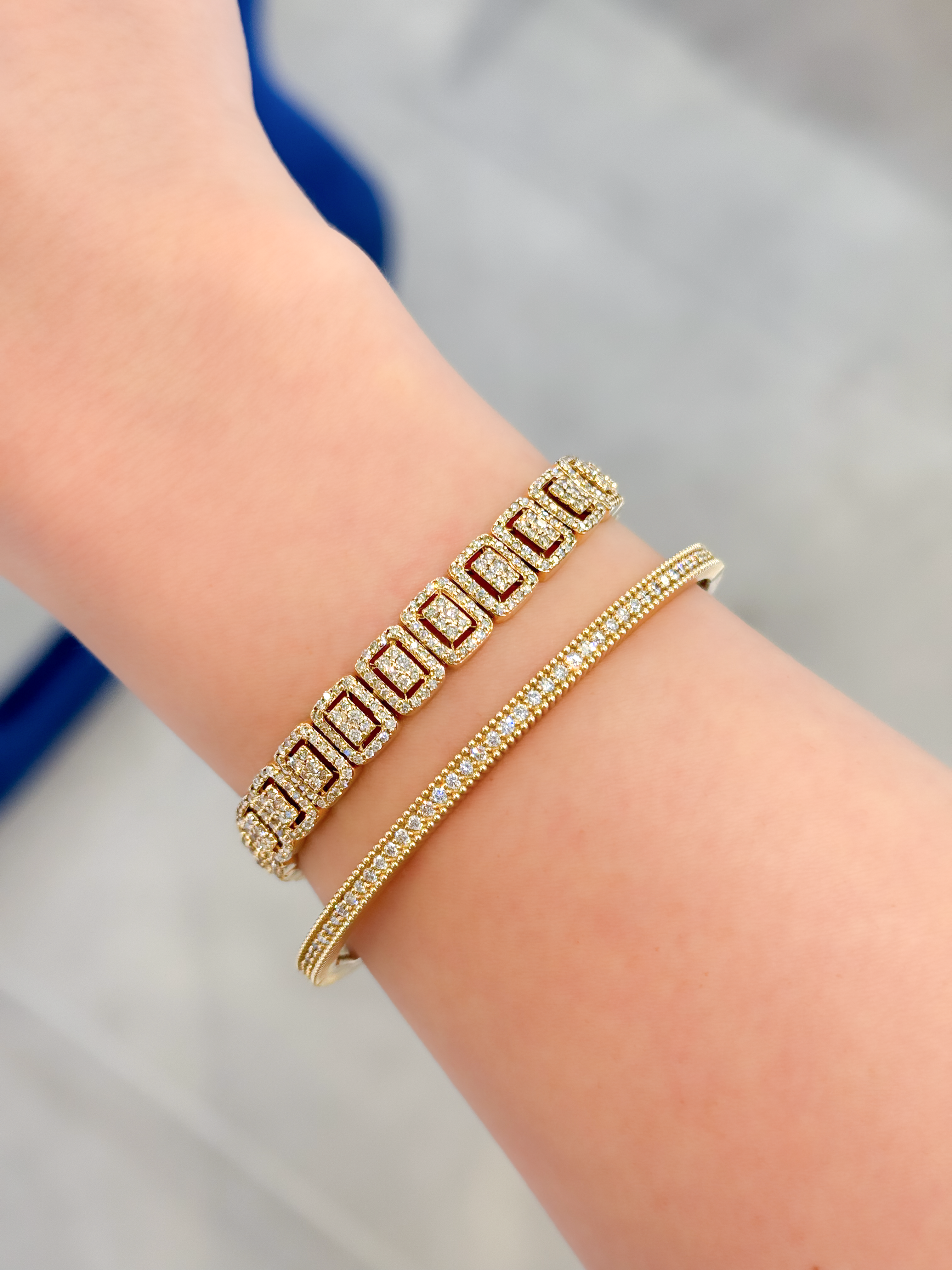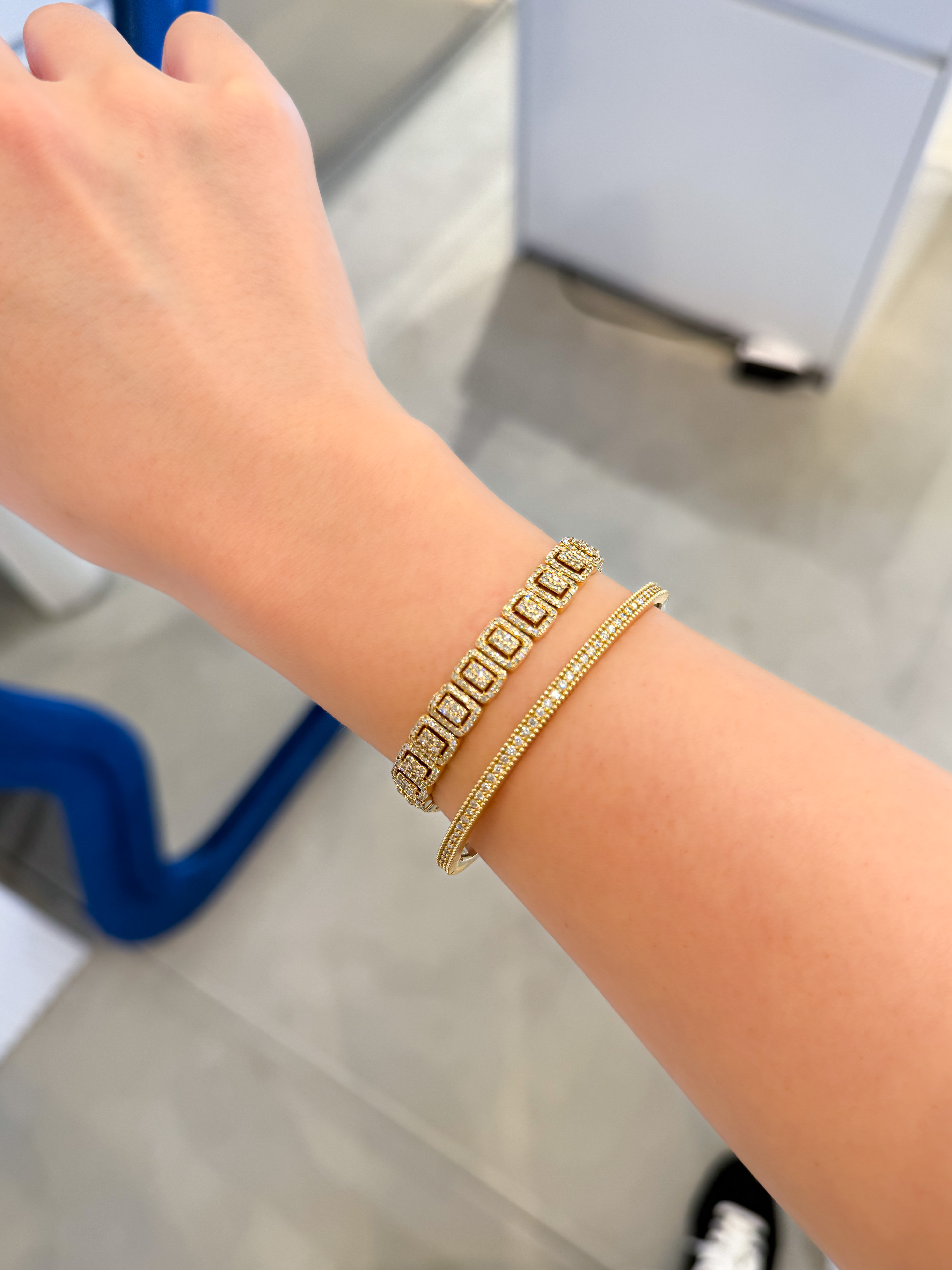 클래식한 라인에 다이아몬드가 정교하게 세팅된 뱅글입니다.