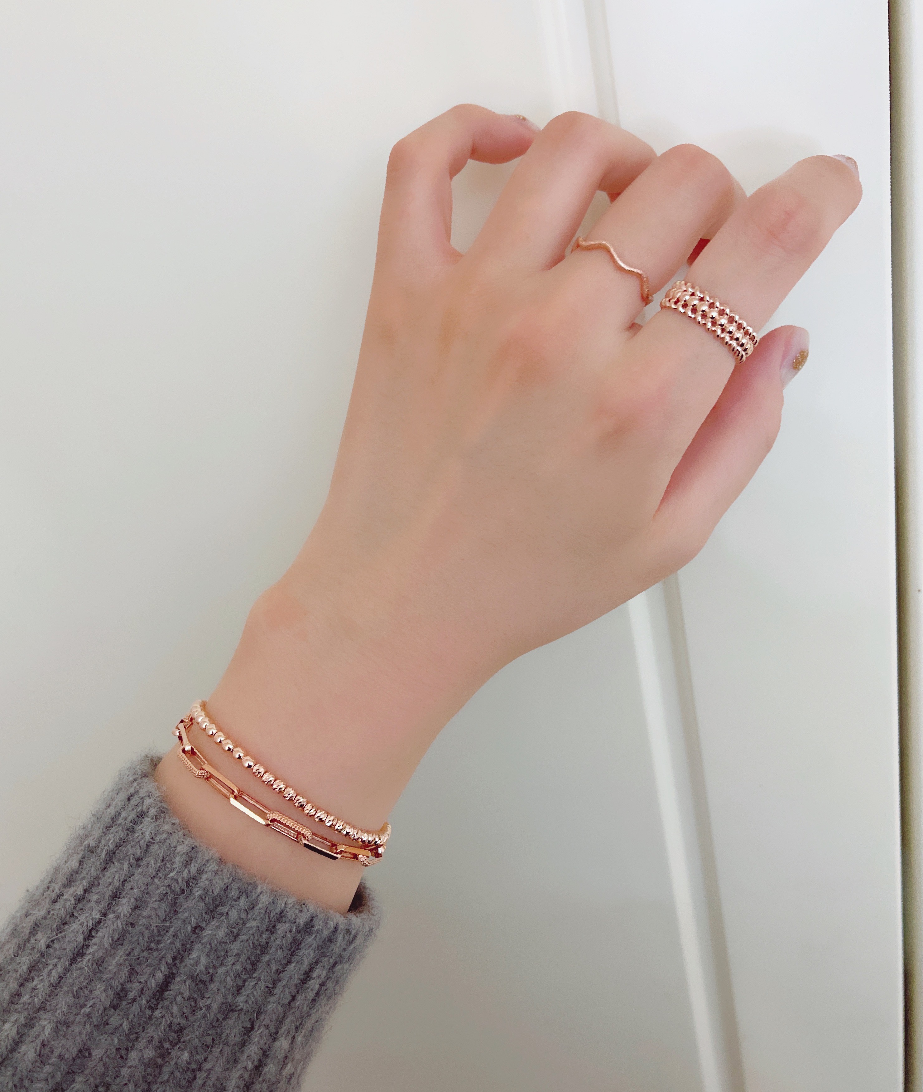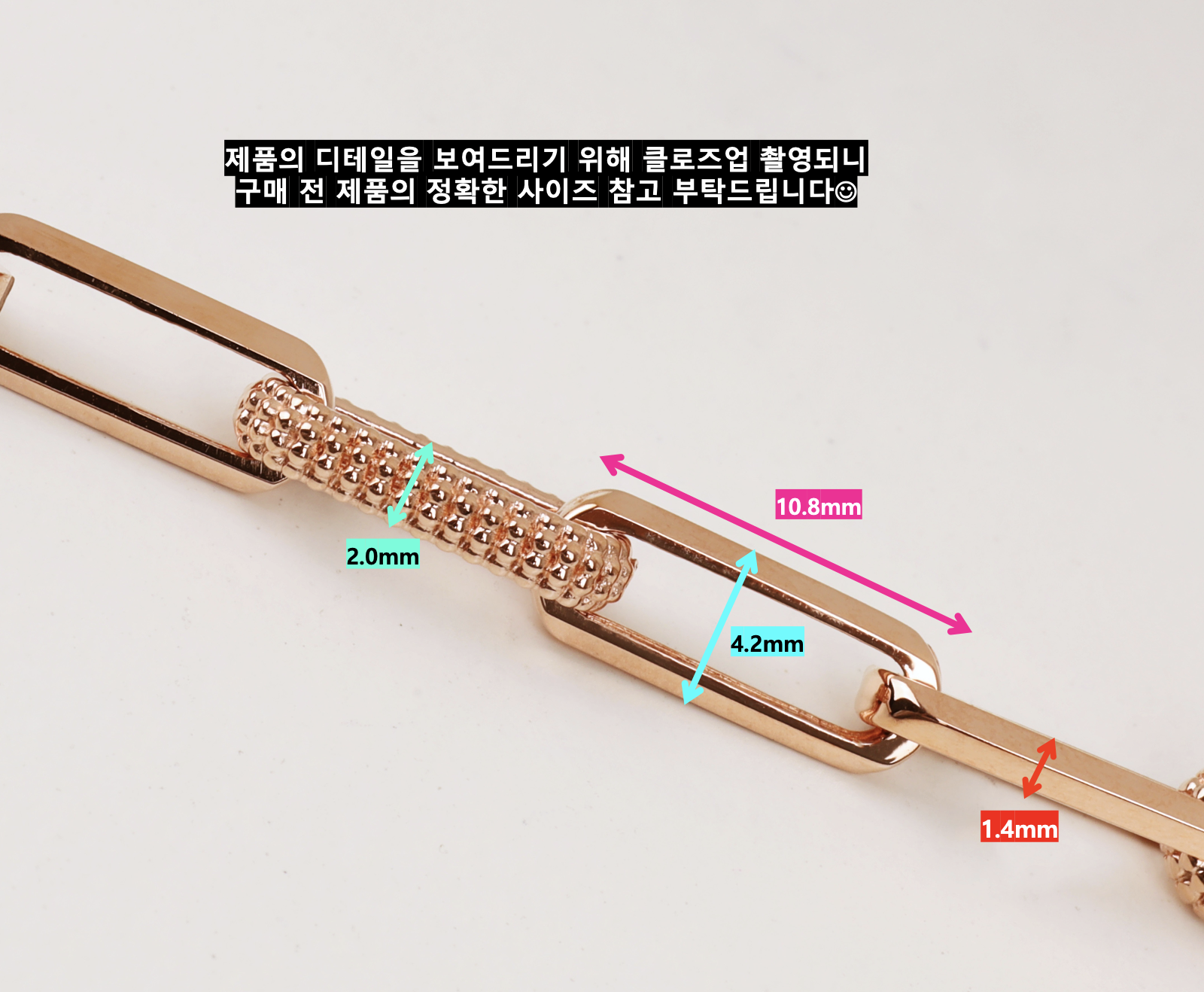 ▫️ 사이즈 팁 : 손목둘레에서 2~3cm 크게 착용 권장드립니다. 모델은 손목둘레 14cm에 체인 17개 길이 16cm 착용했습니다.
