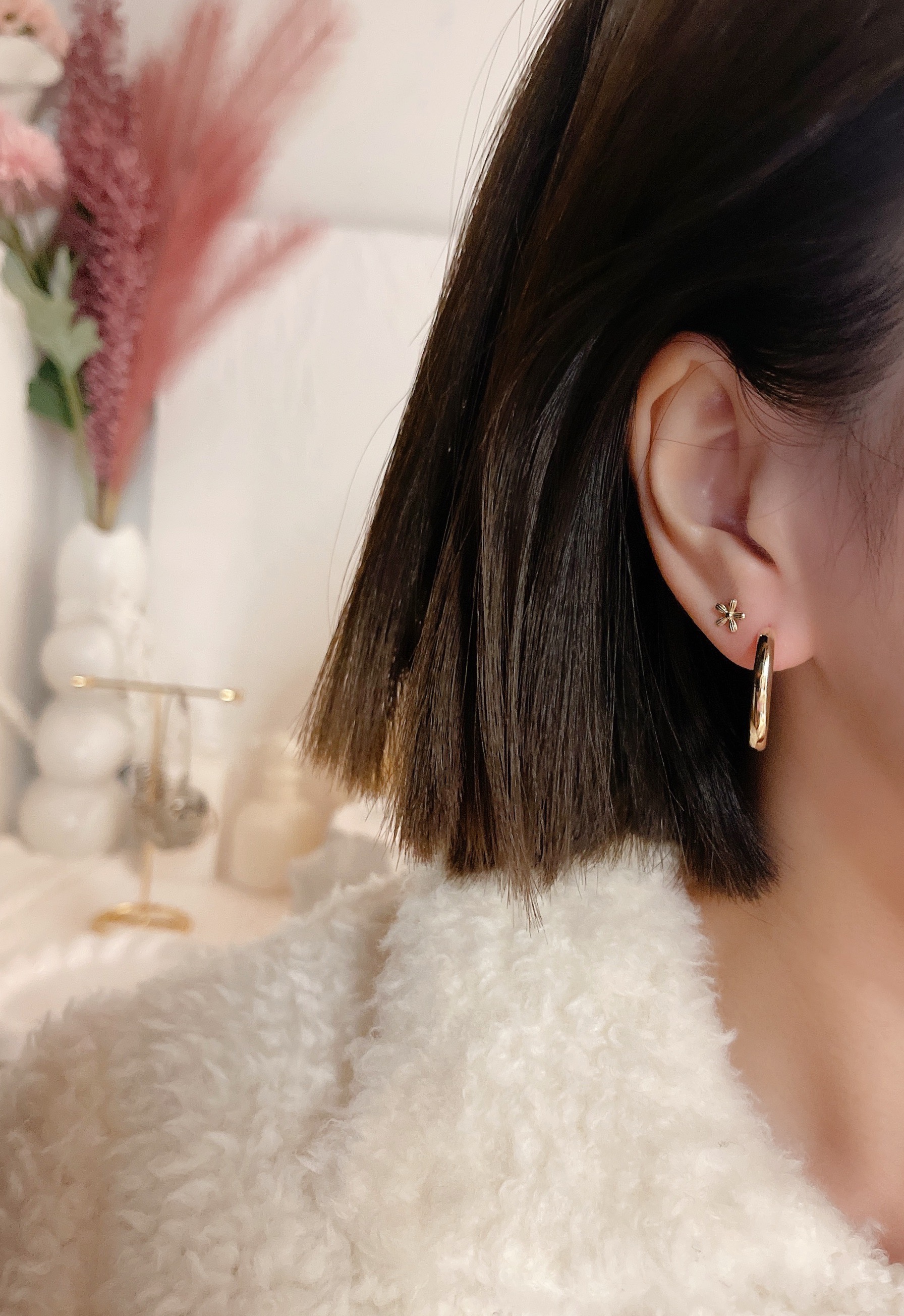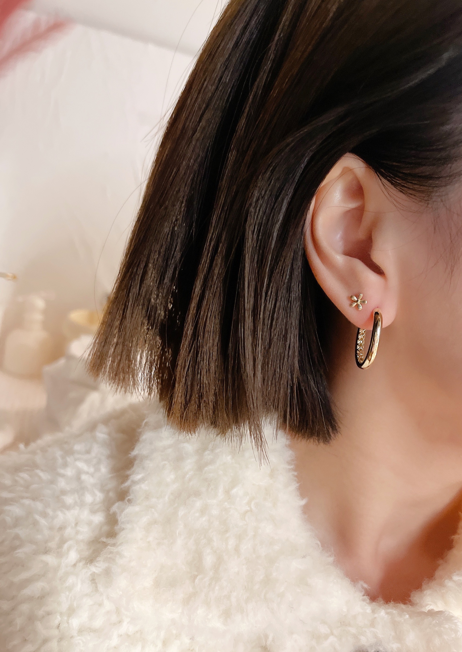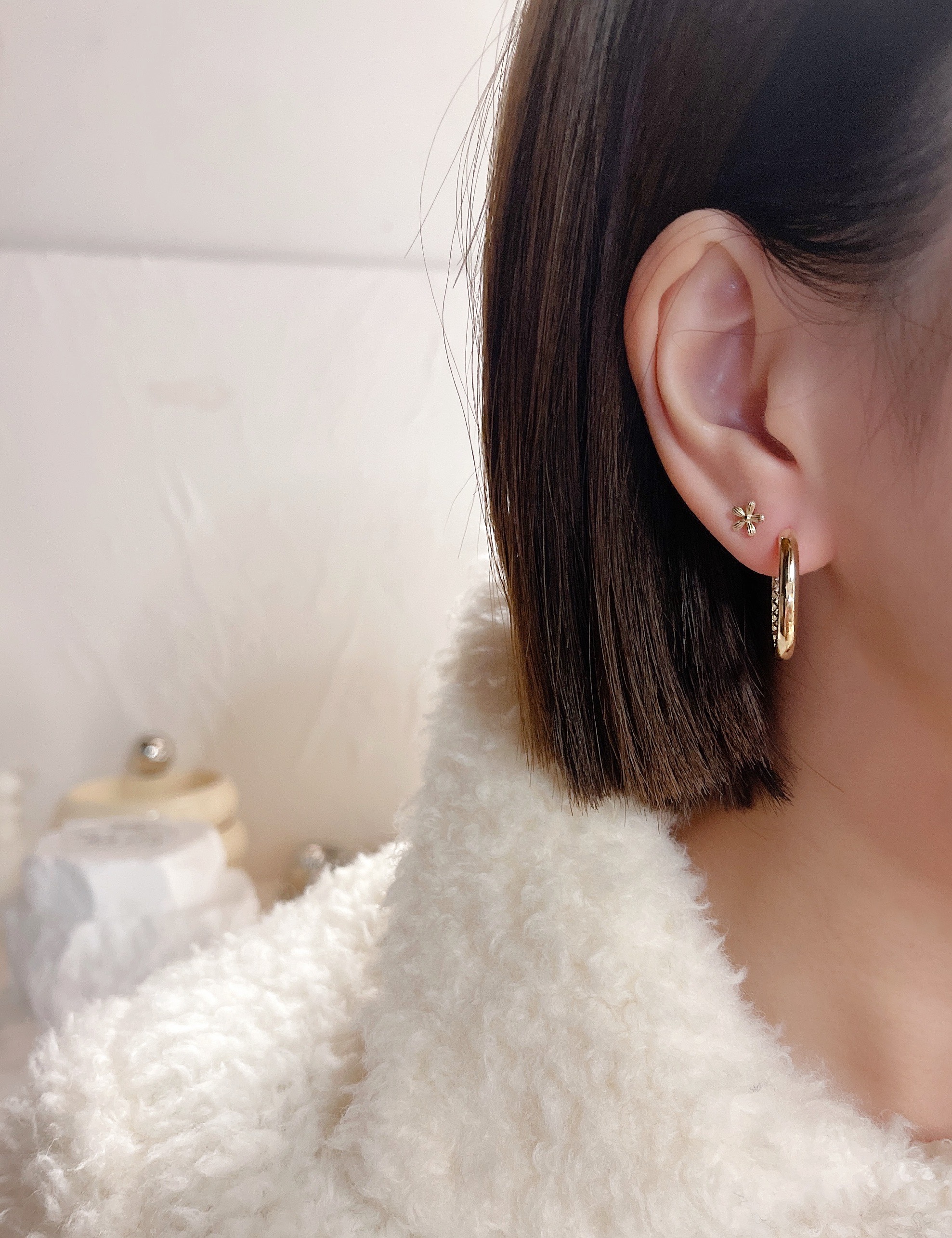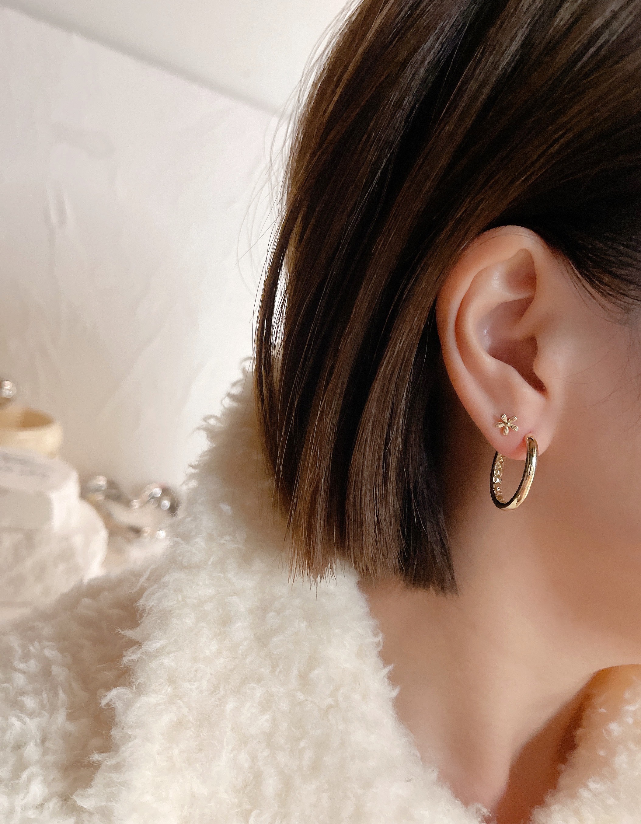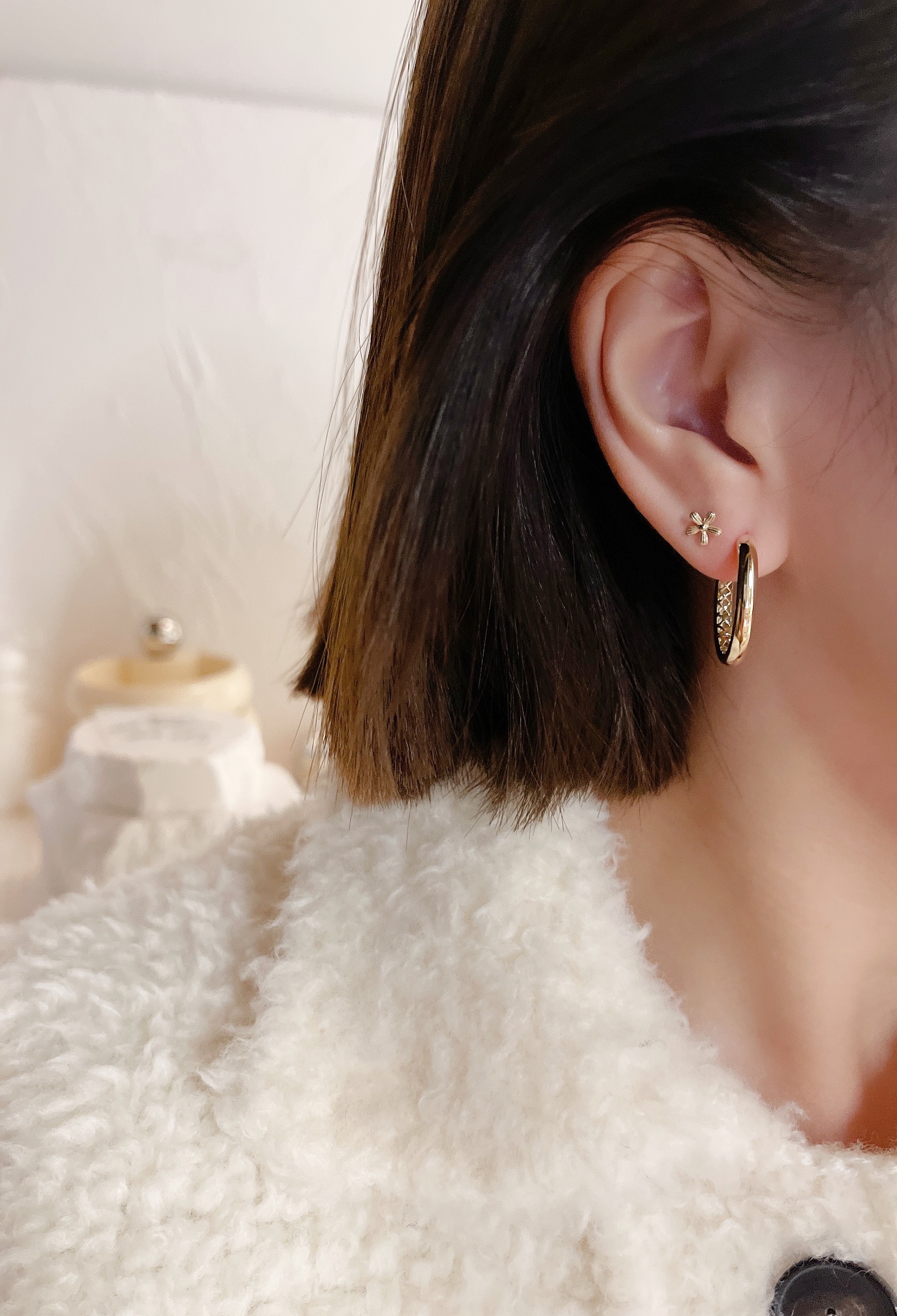 모델은 귀걸이용로 뚫은 구멍에 착용 후 촬영했습니다.